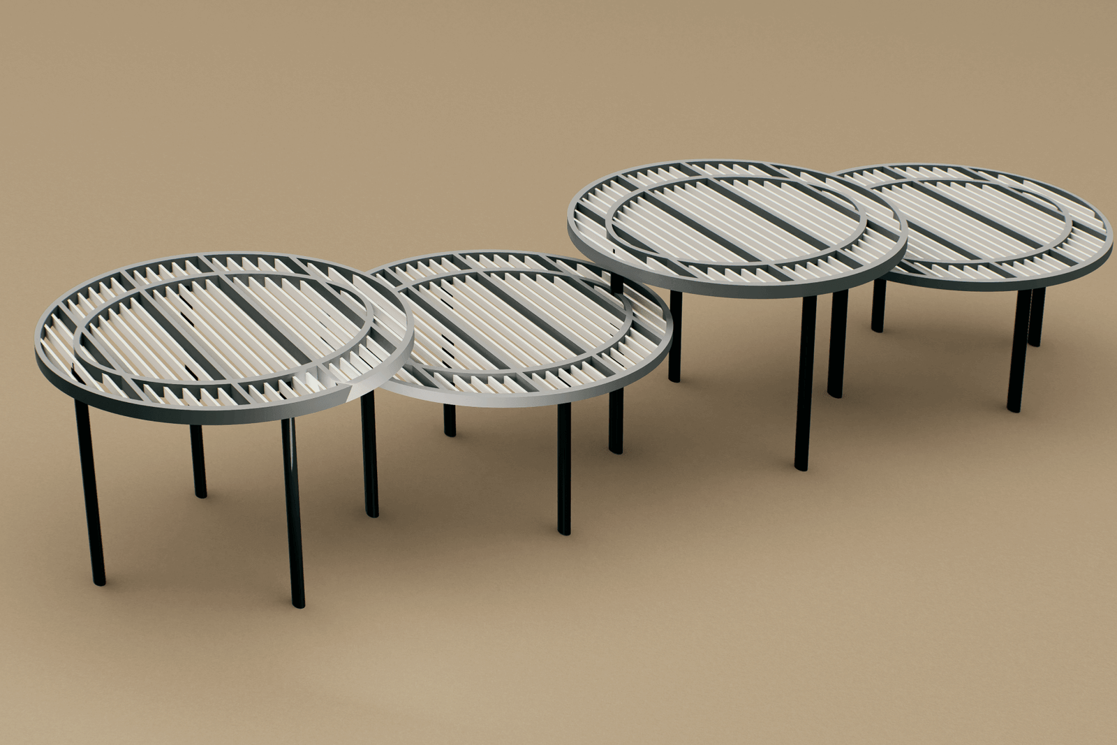 The PARASOL Oval Canopy takes inspiration from the elegant form of traditional parasols, reinterpreted through contemporary architectural design. This freestanding shelter features a gracefully curved oval roof supported by a sturdy steel framework, creating a distinctive silhouette that combines aesthetic appeal with functional sun protection. The design’s organic curves soften the urban landscape while providing generous shaded areas for relaxation and social interaction.