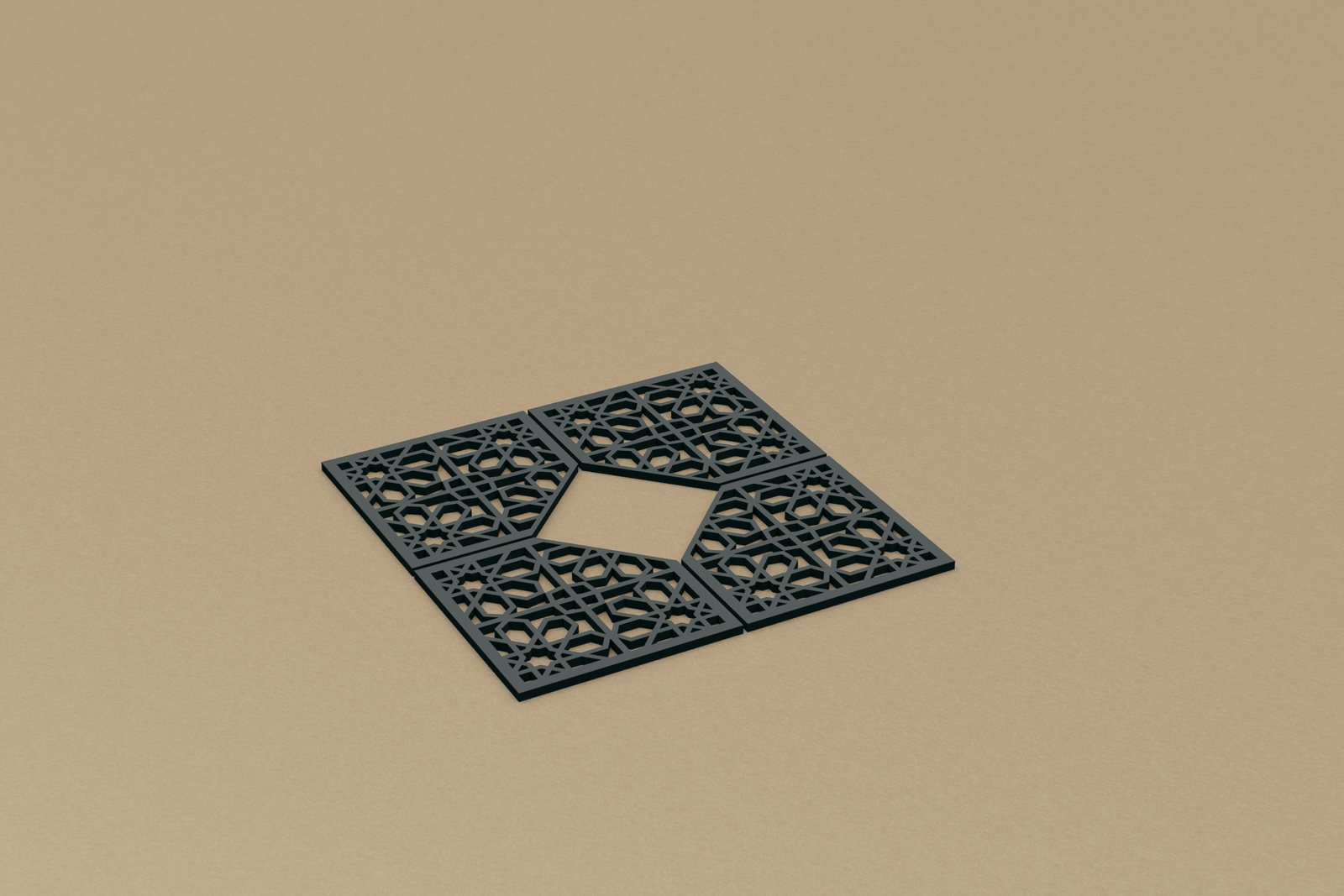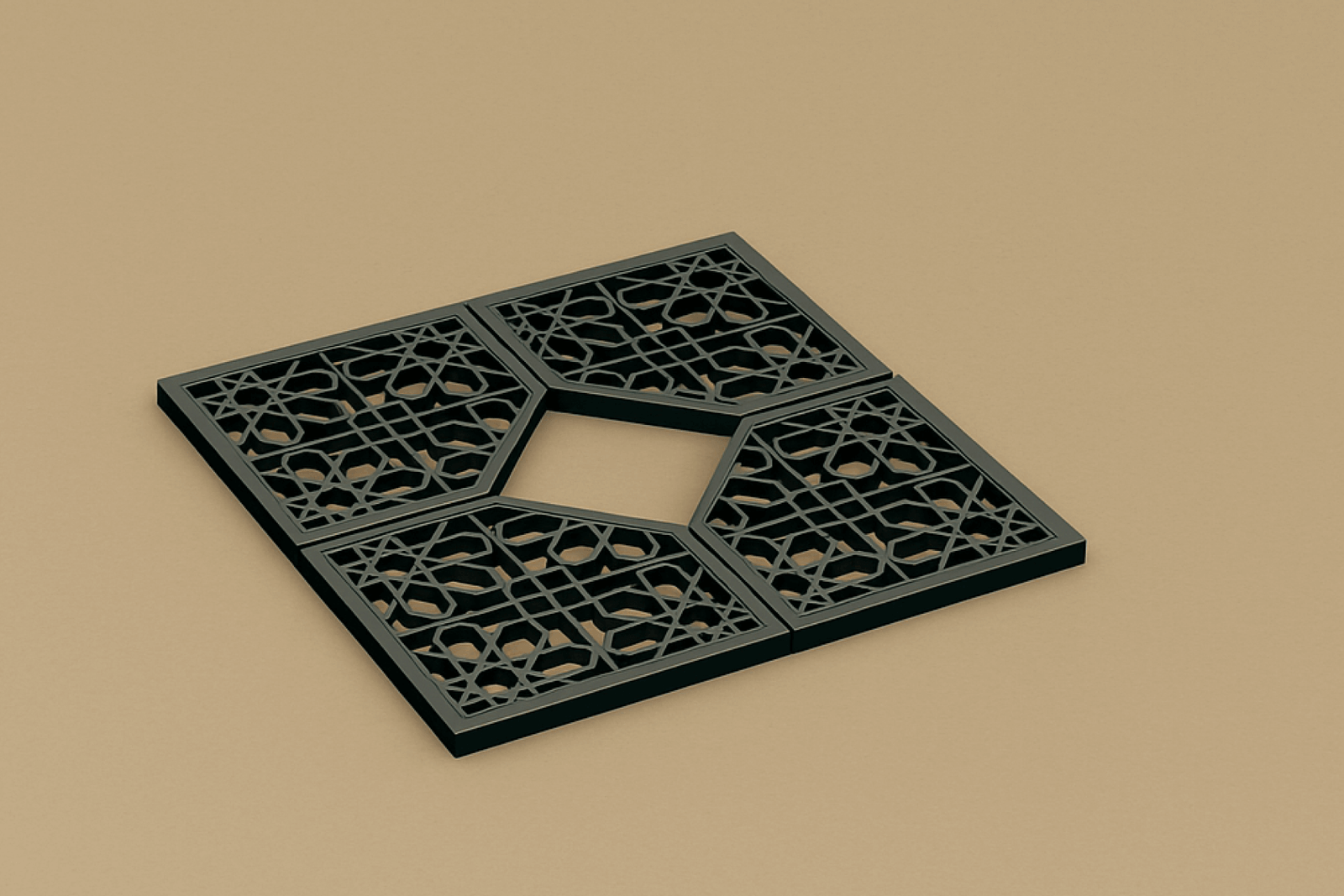 The ZEMARA Tree Grate reinterprets traditional Middle Eastern architectural motifs through contemporary urban design. Named after the Arabic word “Zamara” (meaning “to embellish”), its intricate laser-cut Mashrabiya pattern merges cultural heritage with modern functionality. The square outer frame encloses a striking diamond-shaped inner opening, creating a geometric interplay of light and shadow. Engineered for high-traffic urban environments, ZEMARA provides superior tree protection while enhancing streetscape aesthetics with its ornamental yet durable steel construction.
